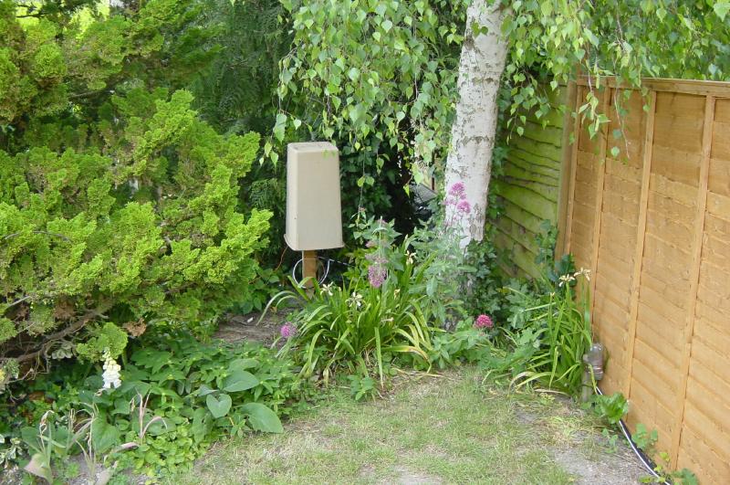 The assembled sheet was then bolted onto a wooden frame and 'weather proofed' by being covered by an upturned plastic kitchen rubbish bin. This keeps the rain off in the summer and (so far) has not proved problemtic due to condensation in the wet British winters.